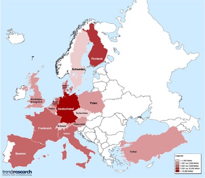 Das Marktforschungsunternehmen trend:research hat die Entwicklung des BHKW-Marktes für fünfzehn europäischen Ländern prognostiziert. Danach wird in Deutschland die Installation neuer BHKWs ab dem Jahr 2015 rapide zulegen. Die Leistung der installierten Blockheizkraftwerke in Europa hat in 2011 laut einer aktuellen Untersuchung von trend:research mit 44.000 MWel einen neuen Höchstwert erreicht. Bis zum Jahr 2020 soll der Wert auf 51.000 MWel ansteigen. Die größte Anzahl an BHKWs wird dann in Deutschland, Finnland, Frankreich und Dänemark zu finden sein.