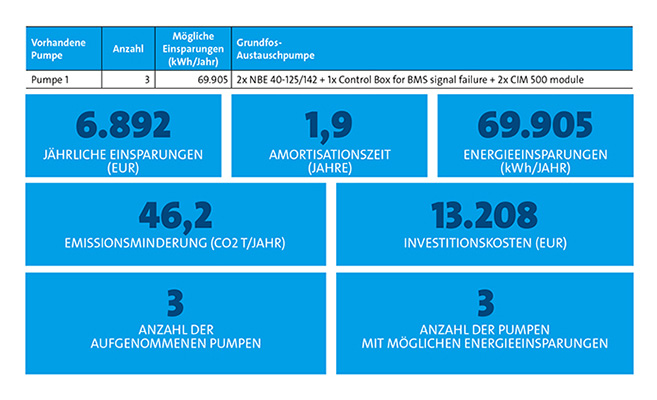 Grundfos bietet kostenlos einen ‚Energy Check‘ an, bei dem speziell geschulte Mitarbeiter die relevanten Daten erheben, in der Regel vor Ort. Der Betreiber muss lediglich einige Angaben zum Betrieb beisteuern. Die Ergebnisse werden in einem kurzen, übersichtlichen Bericht zusammengefasst. Dieser enthält die wesentlichen Daten zu den untersuchten Bestandspumpen, Austauschempfehlungen und die entscheidenden Kennzahlen: Einsparung von Strom, Energiekosten und CO2 sowie Investitionskosten für die Modernisierung und Amortisation. Der Energy Check entspricht ISO 14414 (Energetische Bewertung von Pumpensystemen) und hat eine kalkulatorische Genauigkeit von +/- 10 Prozent, ist also mehr als ausreichend für eine gesicherte Modernisierungsentscheidung.