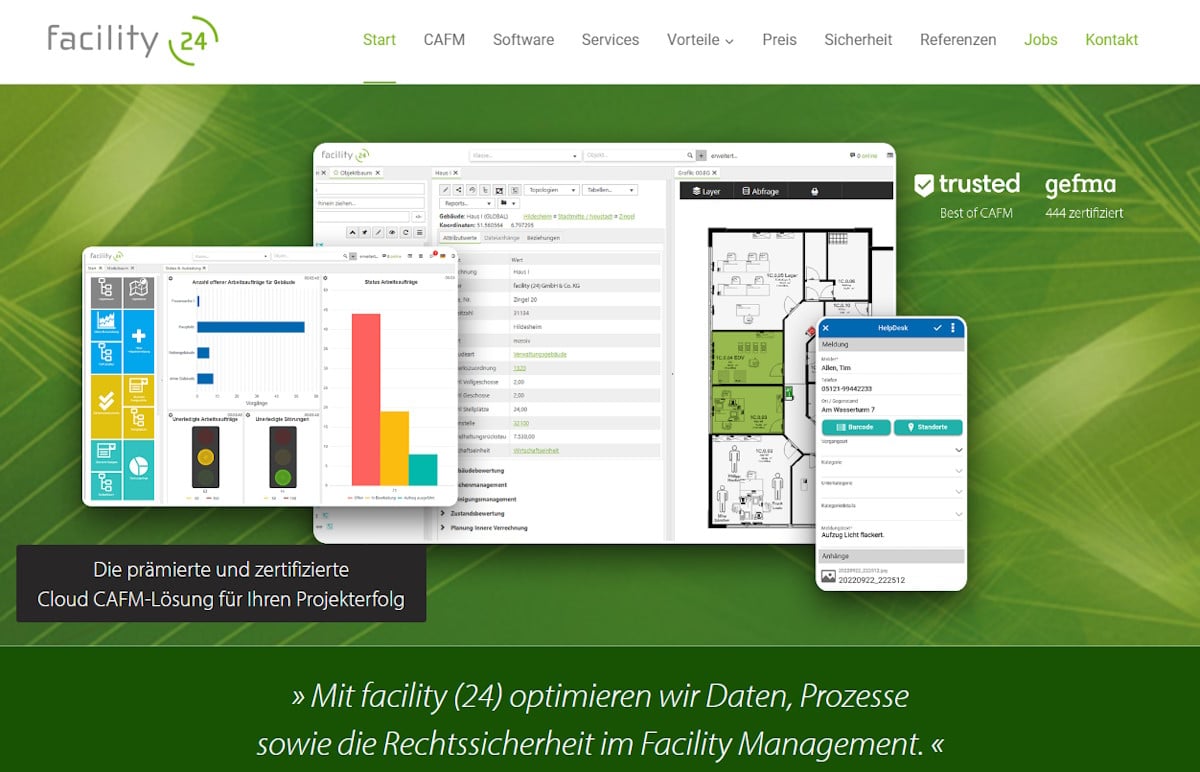 Das Unternehmen facility (24) bietet die Software facility (24) als betriebsfertige Lösung an. Sie kann im Nachgang wie eine vergleichbare Inhouse-Lösung angepasst werden. Neben den üblichen CAFM Dienstleistungen bietet das Unternehmen zusätzlich auch On-demand Services für handliche Tasks und Jour-fixe-Angebote an, mit denen Projekterfolge signifikant vorangetragen werden können.